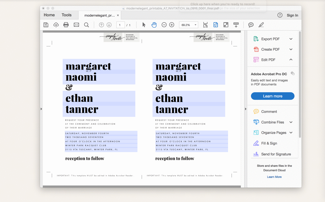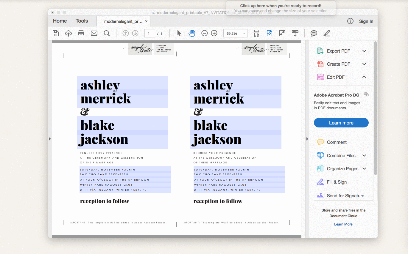 Simply click and type to edit the highlighted text fields on the PDF template. Each template is pre-populated as a guide. Also! No font downloads needed. All useable fonts are embedded in the PDF.
